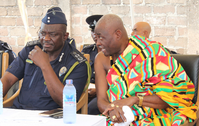 Mr David Asante Apeatu, Inspector General of Police (IGP) (left), in an interaction with Nii Okwei Kinka Dowuona VI (right), Chief of Osu. Picture: BENEDICT OBUOBI