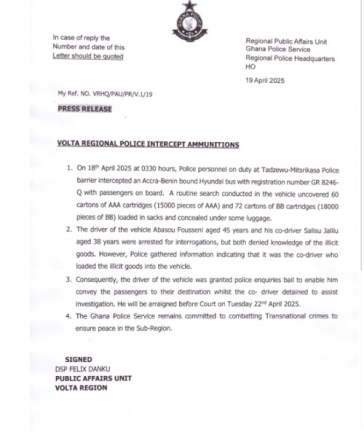 The seizure was made at dawn on Friday, April 18, 2025, during a routine security check at the Tadzewu-Mitsrikasa Police barrier in the Volta Region.