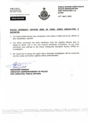 “The Ghana Police Service has monitored a viral video in which one of our officers is seen assaulting a reporter,” the statement, signed by Assistant Superintendent of Police Richmond Mensah, said.