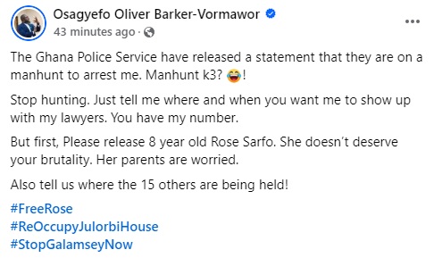 In another post responding to the Police Public Notice, Barker-Vormawor said he was ready to hand himself over to the Police but called for the release of an eight-year-old protestor who was allegedly arrested.