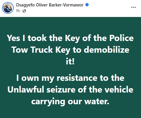 In a Facebook post, he justified his actions, saying, "Yes, I took the key of the police tow truck to demobilize it! I own my resistance to the unlawful seizure of the vehicle carrying our water."