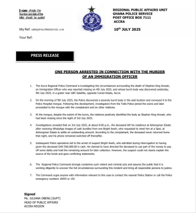 The Accra Regional Police Command has arrested one suspect, Bright Aveh, in connection with the murder of Stephen King Amoah, an Immigration Officer whose burnt body was discovered on July 9, 2025, in a gutter near GBC Satellite, opposite Comet Estate, Accra.