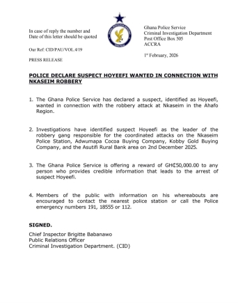 In a public notice issued by the Criminal Investigation Department (CID) on February 1, 2026, police detailed that "investigations have identified suspect Hoyeefi as the leader of the robbery gang responsible for the coordinated attacks on the Nkaseim Police Station, Adwumapa Cocoa Buying Company, Kobby Gold Buying Company, and the Asutifi Rural Bar a area on December 2, 2025."