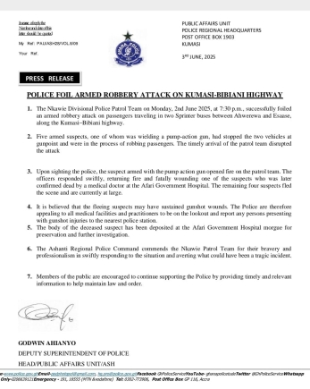 The Ashanti Regional Police Command has launched a manhunt for four armed robbery suspects who fled after attempting to rob passengers aboard two Sprinter buses along the Kumasi–Bibiani highway between Ahwerewa and Esaase.