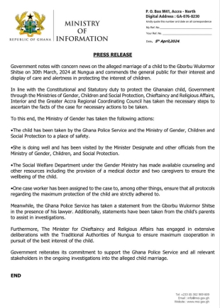 The Ministry affirmed the government's commitment to assisting the Ghana Police Service and other stakeholders in the ongoing investigation of the alleged child marriage.