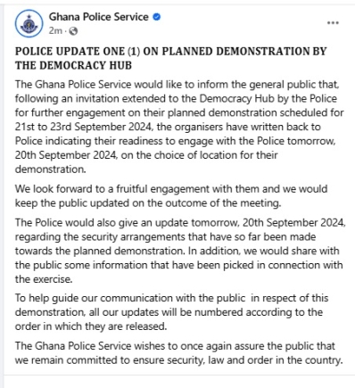 The Ghana Police in a statement Thursday evening explained that "following an invitation extended to the Democracy Hub by the Police for further engagement on their planned demonstration scheduled for 21st to 23rd September 2024, the organisers have written back to Police indicating their readiness to engage with the Police tomorrow, 20th September 2024, on the choice of location for their demonstration."