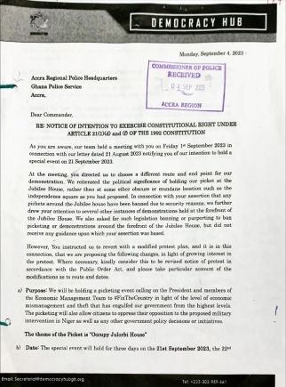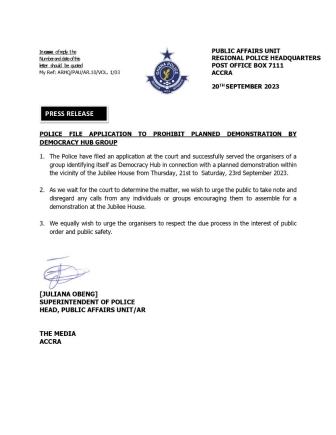 The Ghana Police Service in a statement on Wednesday [Sept 20] said it has filed an application at the High Court in Accra and successfully served organisers of the planned demonstration within the vicinity of Jubilee House from Thursday, 21st to Saturday, 23rd September, 2023.