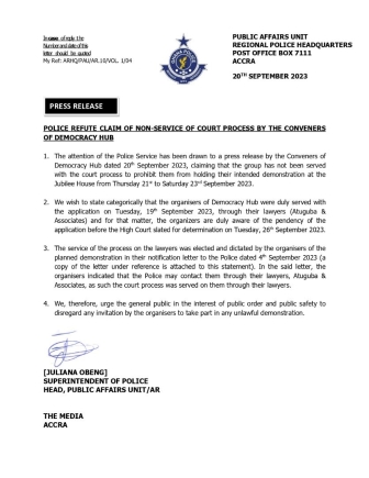 POLICE REFUTE CLAIM OF NON-SERVICE OF COURT PROCESS BY THE CONVENERS OF DEMOCRACY HUB pic.twitter.com/hJXy2NBO3D