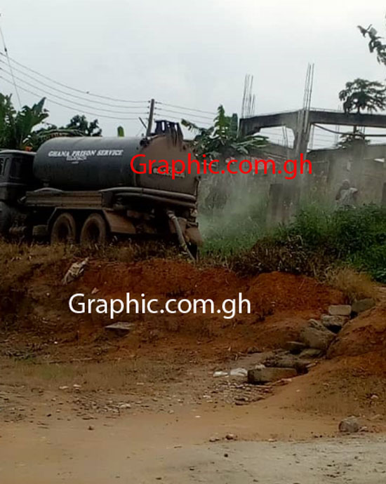PHOTO: The cesspit emptier belonging to the Prisons Service emptying the cesspit behind the accused person's house