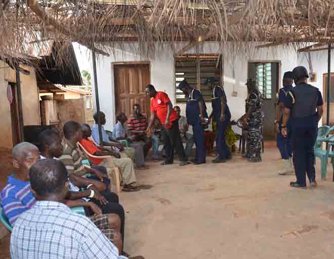 On arrival at Nkonya Ahenkro, COP/Mr. C.T. Yohuno and his men were briefed about the entire situation by the Commander of the joint Police and Military Task Force enforcing the law in the area. In his brief, Capt. K.K. Kumi told the delegation that there was peace in the area.