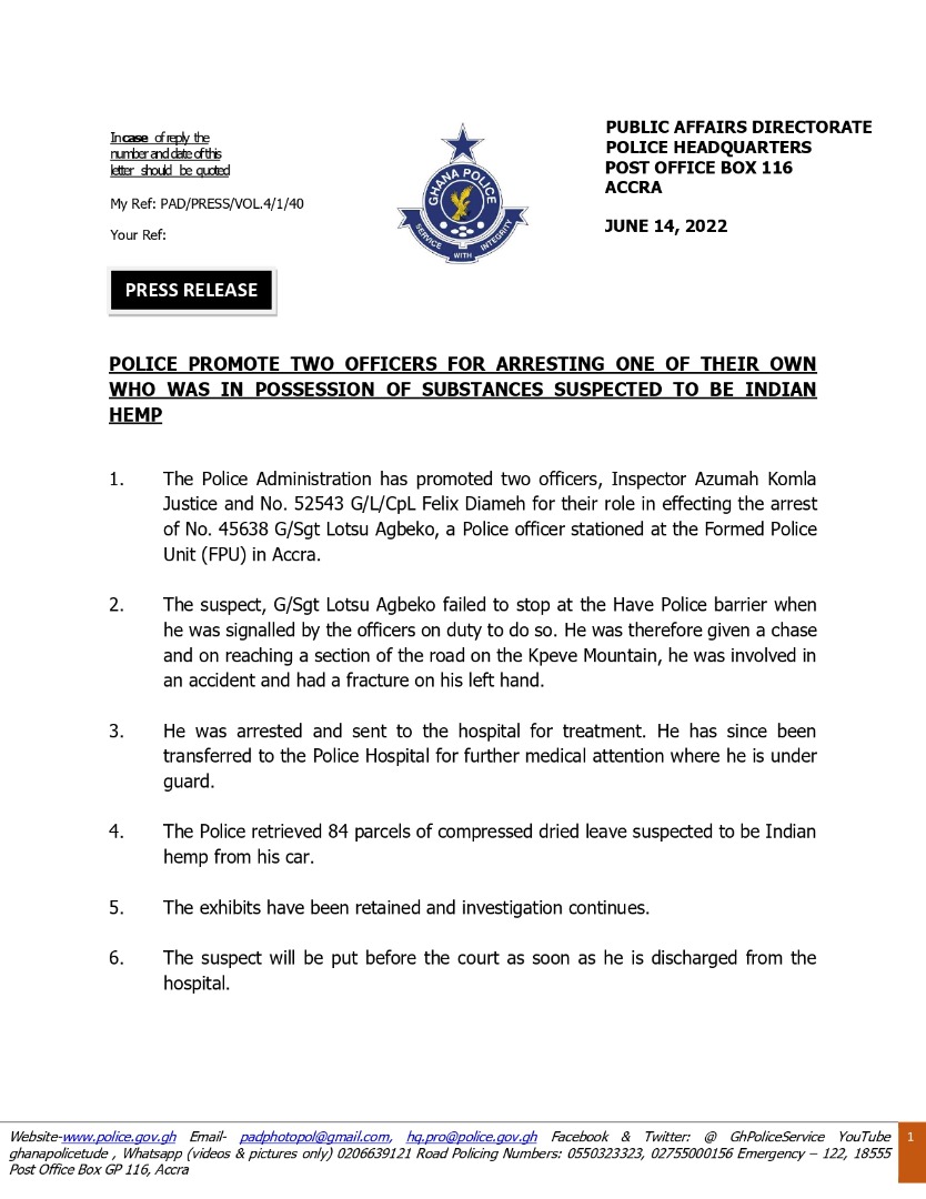Graphic Online gathers that at about 12:30 pm, police officers on patrol duty at the Have barrier had a tip-off that Sergeant Agbeko Lotsu, aged 36, and stationed at the Formed Police Unit at Tesano in Accra, was allegedly transporting dried leaves suspected to be Indian hemp.