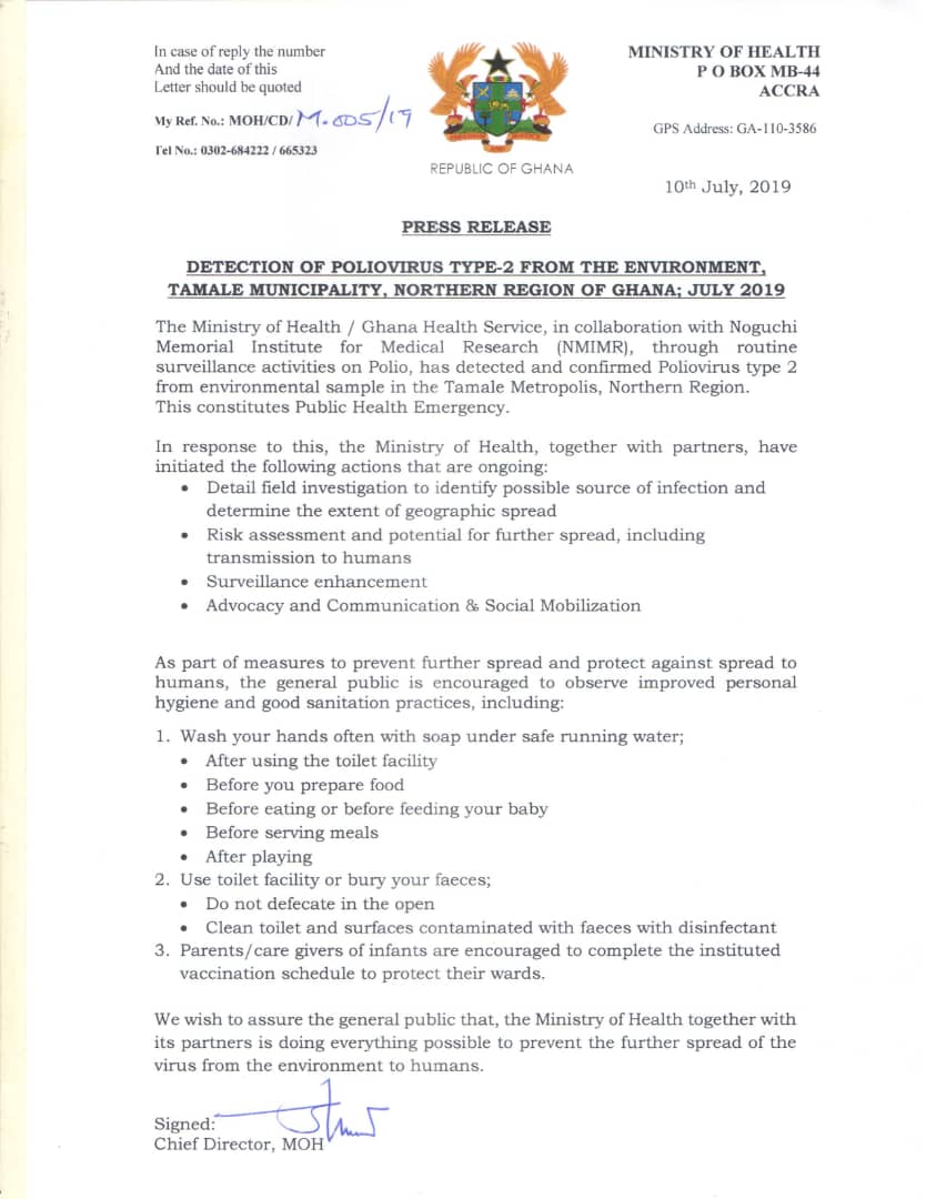 The Ministry of Health (MoH) says it has detected polio virus type 2 in the environment in Tamale in the Northern Region of Ghana which constitutes a public health emergency.