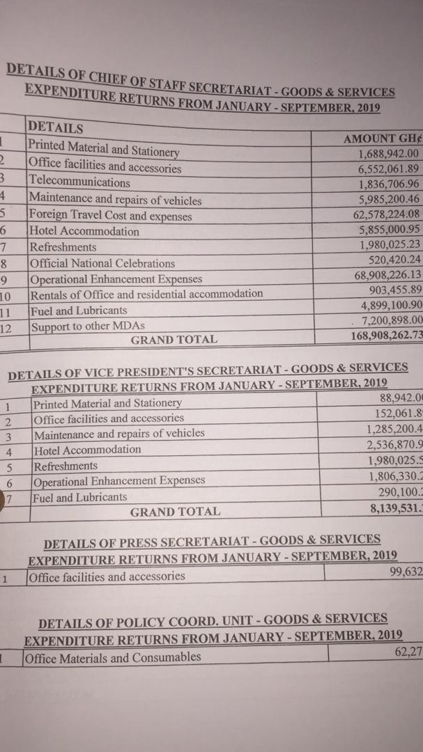 The breakdown of the expenditure indicates that the about GH₵63 million was spent on foreign trips, GH₵5.8 million on hotel accommodation and GH₵1.9 million on refreshments while GH₵68.9 million was spent on operational enhancement expenses.