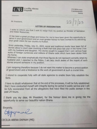 The Minister of Sanitation and Water Resources, Cecilia Abena Dapaah on Saturday afternoon resigned from her position with immediate effect.