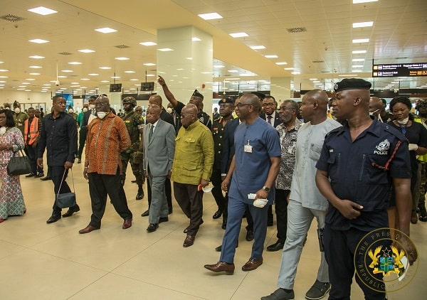 Accompanied by the Minister of Health, Mr Kwaku Agyeman Manu, the President was first at the arrivals terminal of the Kotoka International Airport.