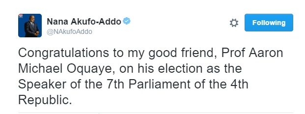 Soon after Nana Addo wrote on his Twitter page: "Congratulations to my good friend, Prof Aaron Michael Oquaye, on his election as the Speaker of the 7th Parliament of the 4th Republic".