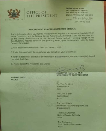 President John Dramani Mahama has appointed Gyamfi Felix as the acting Director-General of the National Service Authority, effective January 22, 2025.