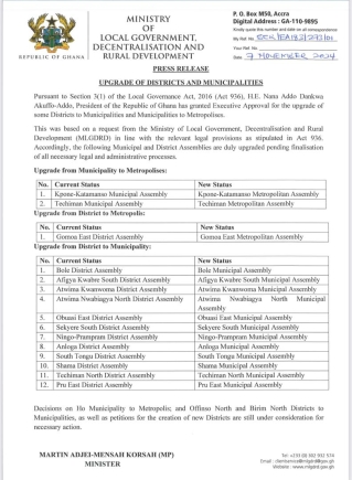 In a statement released by the sector minister, Martin Adjei-Mensah Korsah, on November 7, the government announced that two Municipal Assemblies, namely Kpone Katamanso and Techiman, have been promoted to Metropolitan status. Additionally, Gomoa East District Assembly has also been upgraded to a metropolis.