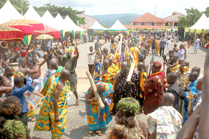 A line-up of divisional chiefs of the Akyem Abuakwa Traditional Area carrying firewood on their shoulders to be presented to Okyenhene during the Ohum durbar at Kyebi. Pictures: Seth Takyi Boateng