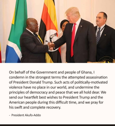 President Akufo-Addo shared his thoughts on social media, stating, "Such acts of politically-motivated violence have no place in our world and undermine the principles of democracy and peace that we all hold dear." He added, "We send our heartfelt best wishes to President Trump and the American people during this difficult time, and we pray for his swift and complete recovery."