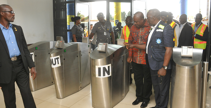 President Mahama being conducted round facilities at the new revenue centre by Mr Richard A.Y Anamoo, Director General, GPHA after the inauguration.