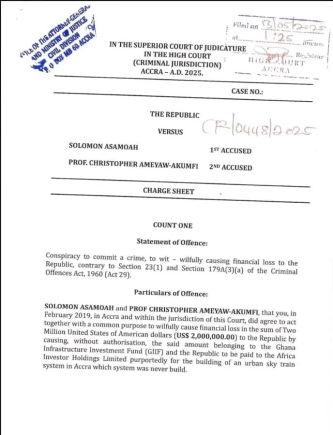 The charge sheet filed by the Attorney-General and Minister of Justice on Tuesday May 13, 2025 indicates that the two agreed to act together with a common purpose to willfully cause financial loss in the sum of US$2 million to the Republic by causing without authorisation, the said amount belonging to the Ghana Infrastructure Investment Fund (GIIF) and the Republic to be paid to the Africa Investor Holdings Limited purportedly for the building of an urban sky train system in Accra, which was never built.