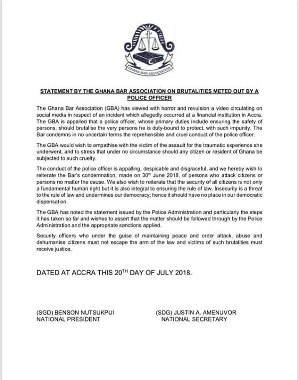 “GBA is appalled that a police officer, whose primary duties include ensuring the safety of persons, should brutalise the very person he is duty-bound to protect, with such impunity. The Bar condemns in no uncertain terms the reprehensible and cruel conduct of the police officer,” said the GBA.