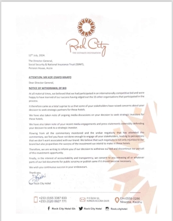 In a letter dated July 12, 2024, addressed to the Director-General of SSNIT, Mr. Kofi Osafo-Maafo, Rock City Hotel expressed their disappointment at the lack of stakeholder engagement, which they believe has led to the negativity surrounding their bid.