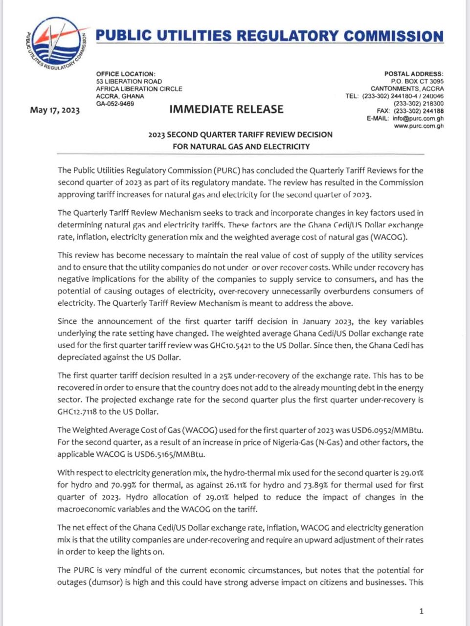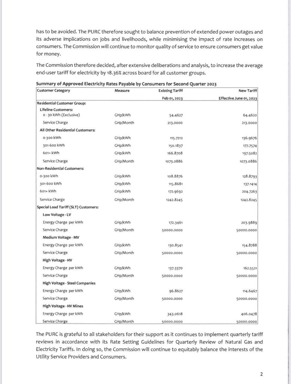 The Public Utilities Regulatory Commission (PURC) has announced an 18.36% increase in tariffs for both electricity and natural gas across all consumer groups.