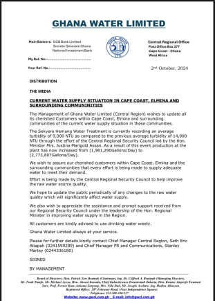 In a statement dated October 3, 2024, the GWCL said as a result, the plant, which provides water to residents of Cape Coast, Elmina and its surroundings, now produces 2,773,807 Gallons/Day, a sharp increase from the previous 1,981,290 Gallons/Day.
