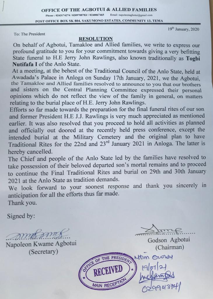 "Efforts so far made towards the preparation for the final funeral rites of our son and former President H.E J.J. Rawlings is very much appreciated as mentioned earlier. It was also resolved that you proceed to hold all activities as planned and officially out doored at the recently held press conference, except the intended burial at the Military Cemetery and the original plan to have Traditional Rites for the 22nd and 23rd January 2021 in Anloga. The latter is hereby cancelled.
