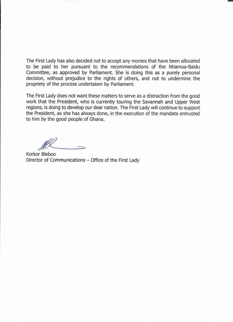 “The First Lady has also decided not to accept any monies that have been allocated to be paid to her, pursuant to the recommendations of the Ntiamoa-Baidu committee, as approved by Parliament. She is doing this as a purely personal decision, without prejudice to the rights of others, and not to undermine the propriety of the process undertaken by Parliament.”