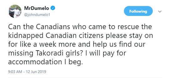 Can the Canadians who came to rescue the kidnapped Canadian citizens please stay on for like a week more and help us find our missing Takoradi girls? I will pay for accommodation I beg.