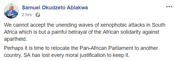 In a post on his Facebook page, Mr Ablakwa said South Africa had lost every moral justification to keep the Pan African Parliament after yet another attack by South African citizens on nationals of African countries.