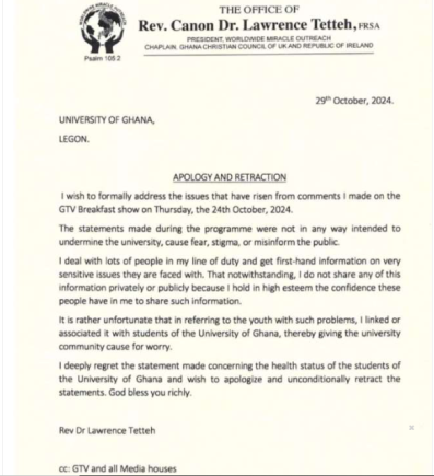 Rev. Tetteh on October 29, 2024, issued a statement to apologise to the university and its stakeholders for the comments he made.