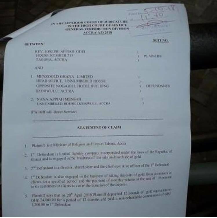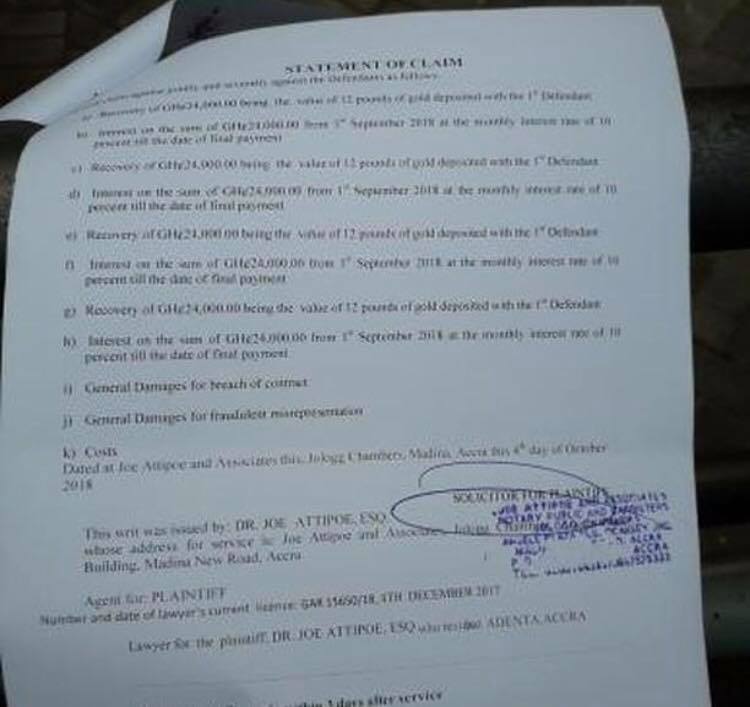 According to the statement of claim accompanying the writ, Rev Odei states that on April 20, 2018, he deposited 12 pounds of gold estimated at Gh₡24,000 for a period of 12 months and paid a non-refundable commission of Gh₡1200 to