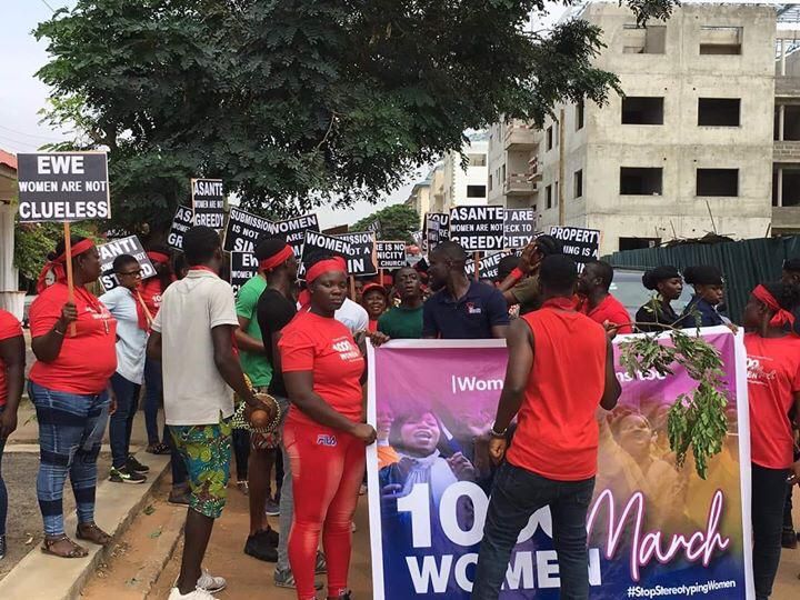 The women protesters, clad in red arm and head bands carried placards bearing inscriptions such as “Fanti women are not stupid”, “Asante women are not greedy”, “Ewe women are not clueless”, and “Property owning is a blessing.”