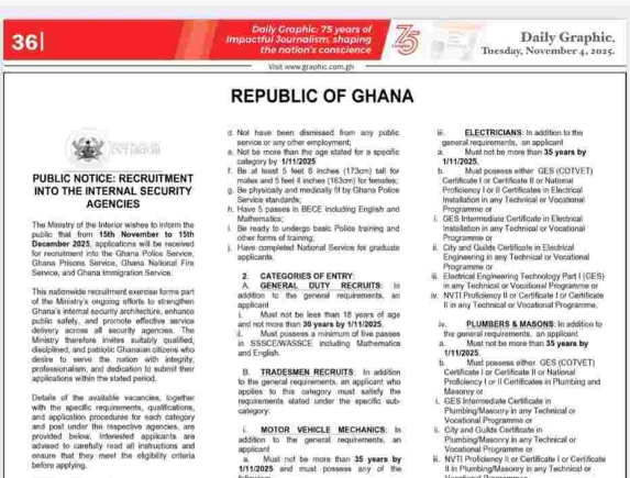The Ministry of the Interior announced on Tuesday that applications for recruitment into the Ghana Police Service, Ghana Prisons Service, Ghana National Fire Service and Ghana Immigration Service will open on November 15 and close on December 15, 2025.