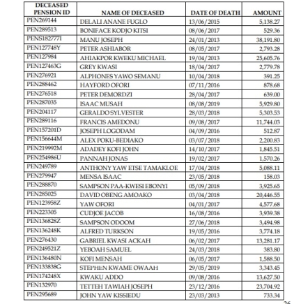According to the Auditor General, the deceased who died between 2013 and 2019 are still benefiting from unearned pension totaling GH¢393,315.06 so far.