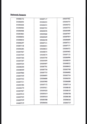 Consequently, owing to the failure or refusal of the other holders to comply with the directive, the underlisted 341 unreturned Diplomatic and 360 Service Passports bearing the following serial numbers have been hereby CANCELLED with immediate effect on the instructions of the Honourable Minister for Foreign Affairs.