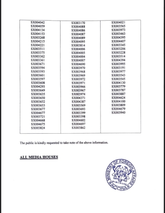 In a press statement dated, May 6, 2025, the Ministry of Foreign Affairs indicated that owing to the failure or refusal of the other holders to comply with the directive, "the underlisted 341 unreturned Diplomatic and 360 Service Passports bearing the following serial numbers have been hereby CANCELLED with immediate effect on the instructions of the Honourable Minister for Foreign Affairs."