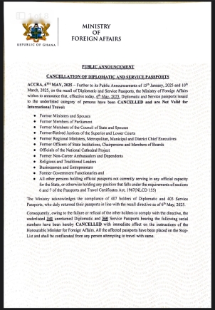 ACCRA, 6TH MAY, 2025 - Further to its Public Announcements of 15th January, 2025 and 10th March, 2025, on the recall of Diplomatic and Service Passports, the Ministry of Foreign Affairs wishes to announce that, effective today, 6th May, 2025, Diplomatic and Service passports issued to the underlisted category of persons have been CANCELLED and are Not Valid for International Travel: