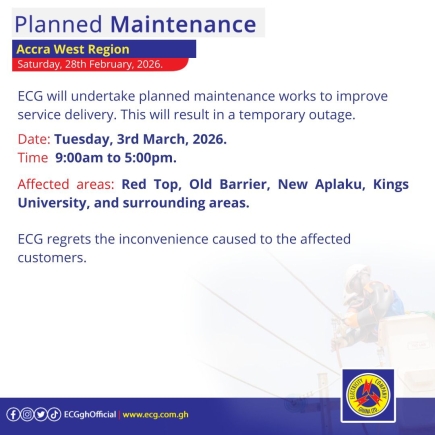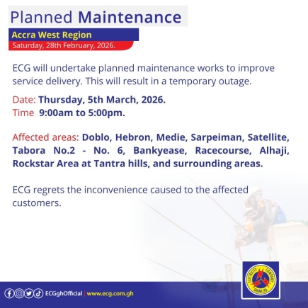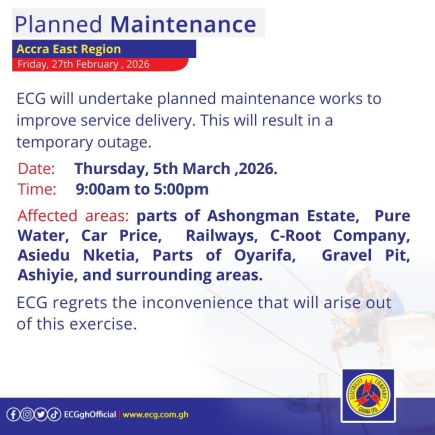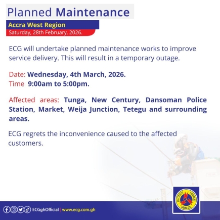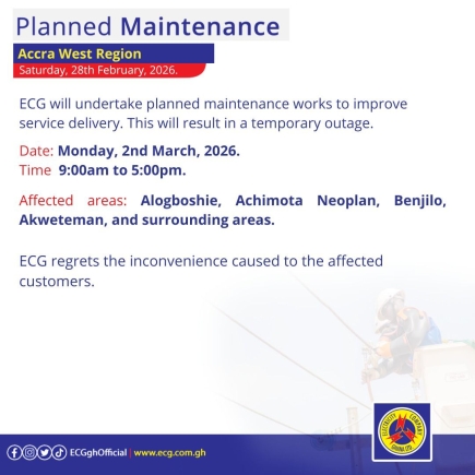 In all its notices, the Electricity Company of Ghana expressed regret for any inconvenience these exercises may cause and urged affected customers to take the necessary precautions. For further updates, residents can visit the company's official website at www.ecg.com.gh or follow their social media handles on Facebook, Instagram, and Twitter.