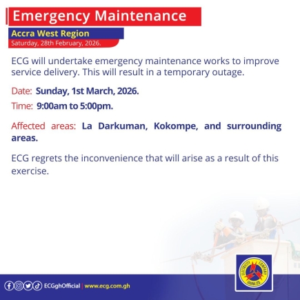 The Accra West Region will also experience an outage on Sunday, though this has been classified as an emergency maintenance. Areas affected include La Darkuman, Kokompe, and their environs. The company noted that this emergency work is necessary to address urgent network faults. "ECG regrets the inconvenience that will arise as a result of this exercise," the notice read.