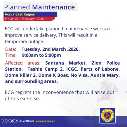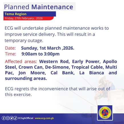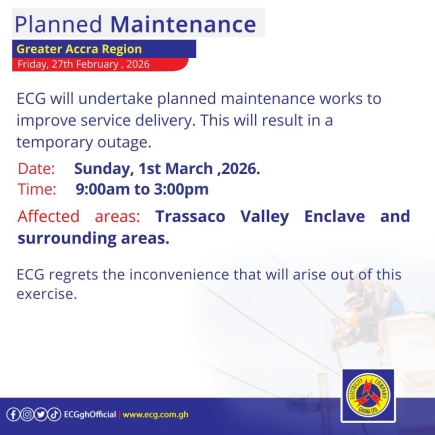 In a statement signed by the Communications Department and issued on Friday, February 27, ECG assured residents that the disruptions are necessary to undertake critical infrastructure improvements. "ECG will undertake planned maintenance works to improve service delivery. This will result in a temporary outage," the company stated in multiple notices circulated to the public.