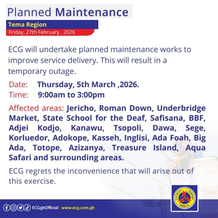 The Electricity Company of Ghana has announced a series of planned and emergency maintenance works across its operational regions, scheduled to take place from Sunday, March 1, through to Thursday, March 5, 2026.