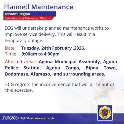 In the Ashanti Region, an emergency maintenance exercise is scheduled for Sunday, February 22, from 11:00am to 2:00pm. This will affect "Barekese Headworks, Ahenkro, Kodie, Aduamoa, Aduman, Seidi, Nkawie, Afari, Toase, Gyankobaah, Kasaprako, Sepaase, Hiawu Besease, Edwanfo, Abuakwa Maakro, Tetrem and surrounding areas." A planned maintenance exercise will also take place on Tuesday, February 24, from 9:00am to 4:00pm, affecting "Agona Municipal Assembly, Agona Police Station, Agona Zongo, Bipoa Town, Bodomase, Afamaso, and surrounding areas."
