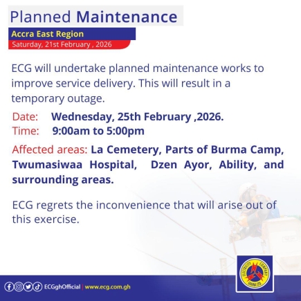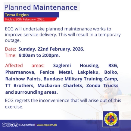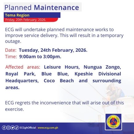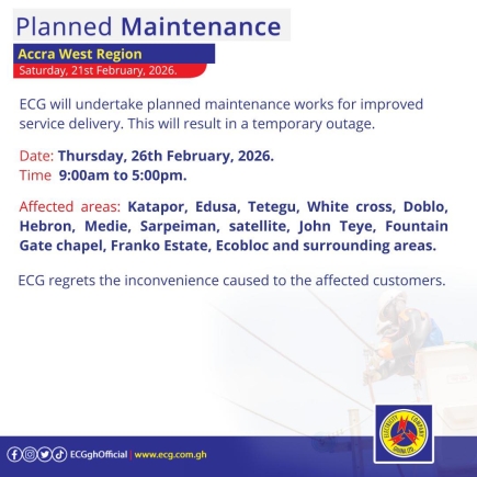 Finally, on Thursday, February 26, a maintenance exercise from 9:00am to 5:00pm will impact "Lakeside Estate Com. 6 & 8, New Legon, Block factory (East Legon), Sasaabi Township, Mensah Bar, and surrounding areas."