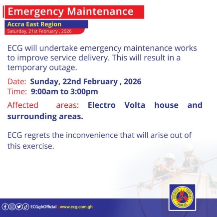 The Accra East Region has a busy week of maintenance. On Sunday, February 22, an emergency maintenance exercise will take place from 9:00am to 3:00pm, affecting "Electro Volta house and surrounding areas." Monday, February 23, will see a planned outage from 9:00am to 5:00pm for "Teiman, Ga East Hospital, Boshe Norman, and surrounding areas."