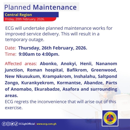 A second, more extensive maintenance exercise is planned for Thursday, February 26, during the same hours. This will affect "Abonko, Anokyí, Henii, Nananom junction, Roman hospital, Bafikrom, Greenwood, New Nkusukum, Krampakrom, Inshalahu, Saltpond Zongo, Kurankyekrom, Kormantse, Abandze, Parts of Anomabo, Ekurabadze, Asafora and surrounding areas."